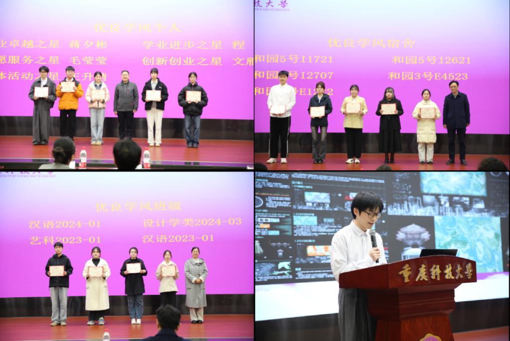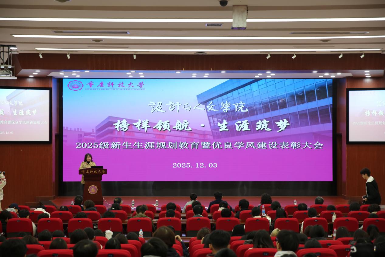 为涵育优良学风,引导2025级新生树立学习规划意识,12月3日晚,设计与人文学院于学术报告厅开展2025级新生生涯规划教育暨优良学风建设表彰大会。相关职能部门领导、学院班子成员、各系主任、全体辅导员、2025级全体新生及获奖学生代表参会,会议由学院党总支副书记周述敏主持。